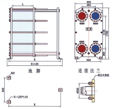 框架包括一个固定压紧板和一个活动压紧板,由上导杆与下导杆支承,在另‘端有一支柱。压制成的波纹板片悬挂在两板之间的上导杆上,移动活动压紧板将板片组压紧,再用一组夹紧螺柱将固定压紧板和活动压紧板夹紧至一定尺寸。两种介质经固定(或活动)压紧板上法兰孔流入由波纹板片组成的各自通道,热交换后介质再由固定(或活动)压紧板上的法兰孔流出。同定压紧板、活动压紧板、支柱及导杆均为低碳钢。考虑到用户的多种使用要求,框架设计有多种型式,主要有双支撑框架式和常用的落地式等,也可根据用户的要求更改框架的型式。